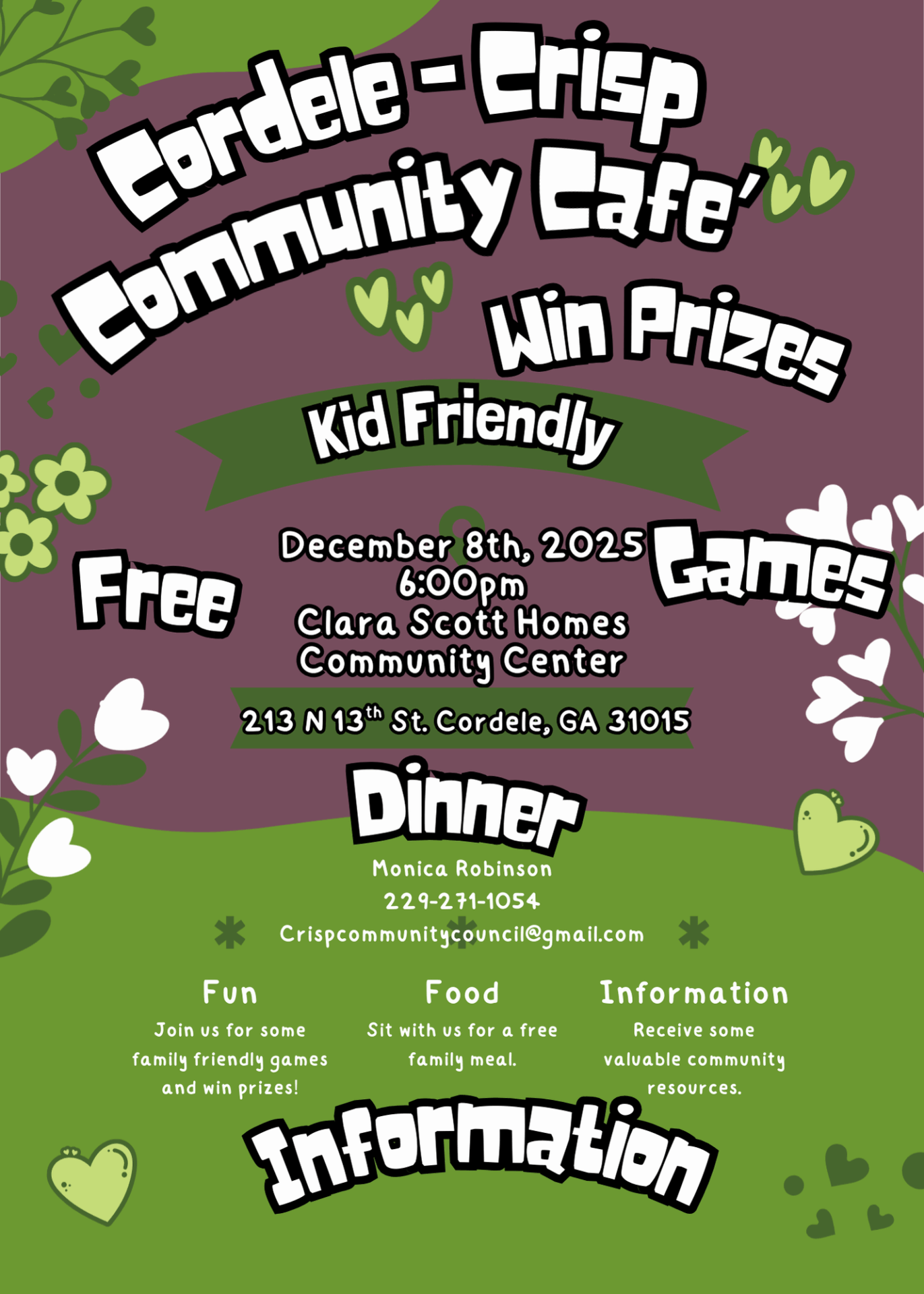The community cafe is open to all ages. Come join us for a hot meal, great discussion on important topics and great prizes.